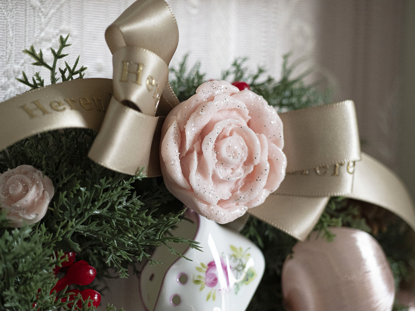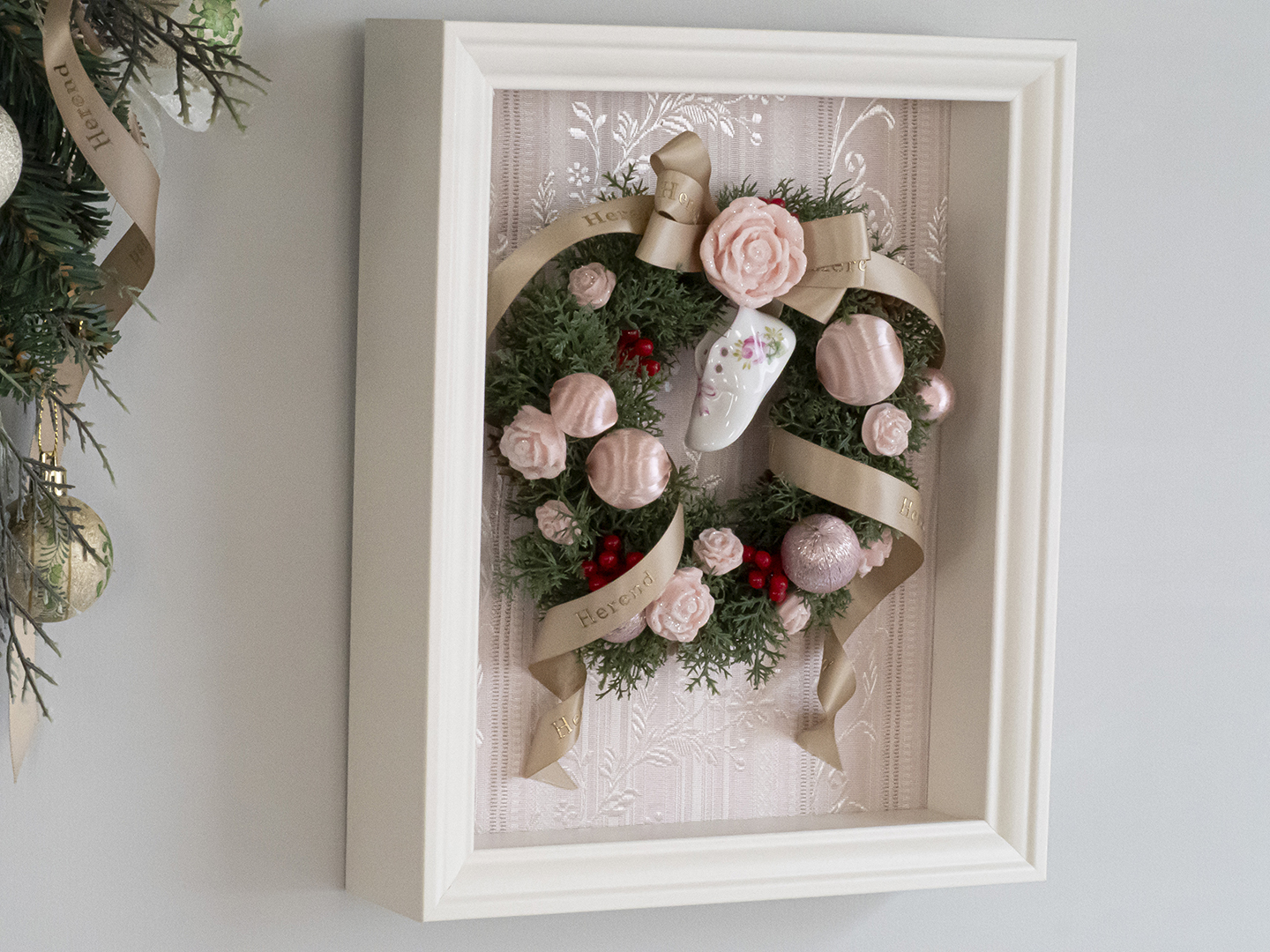心躍るクリスマスに向けて< HEREND×朝霧舞 >のコラボレーションで贈る、ウィーンの薔薇ミニベビーシューズの『ローズボヌールリース』。