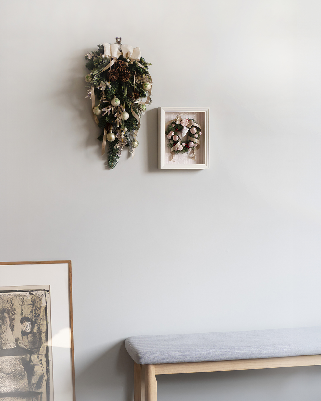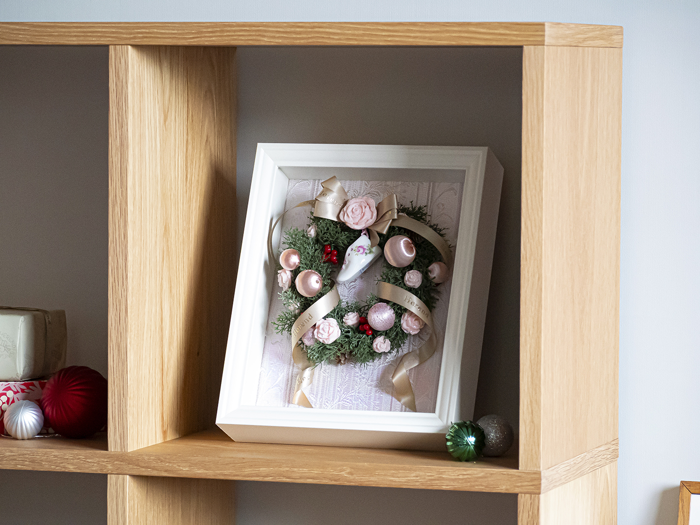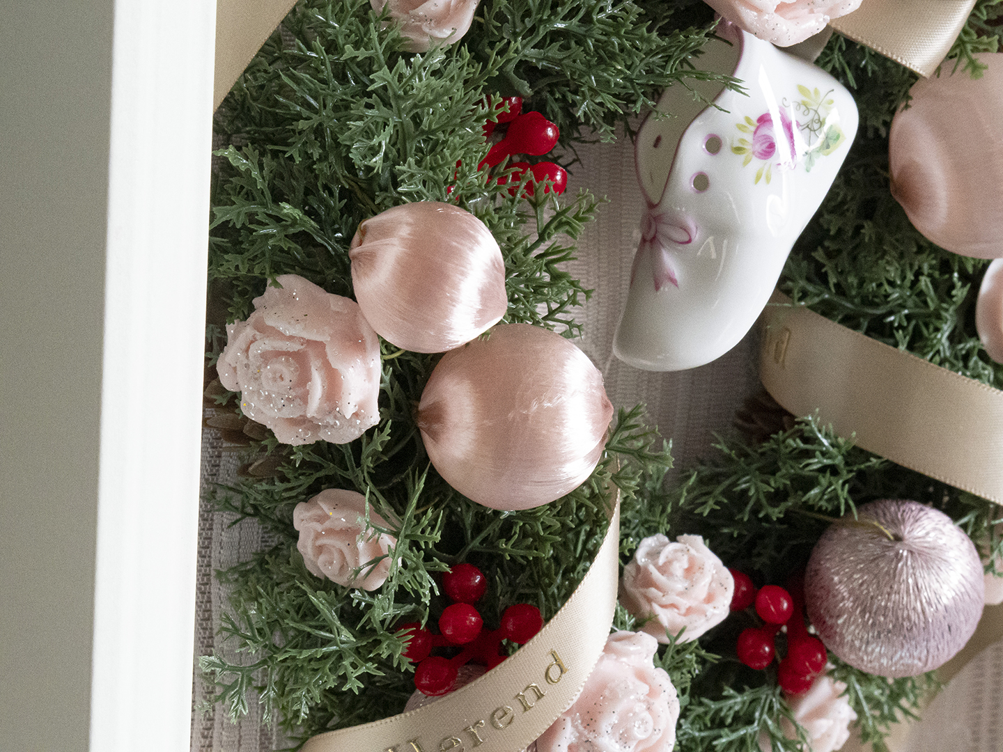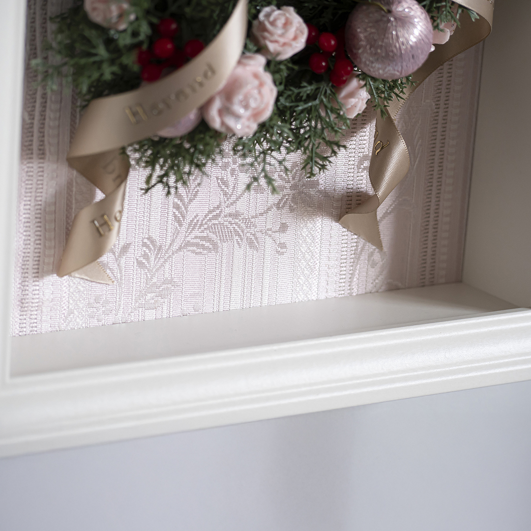 上品な淡いピンクのカラーでまとめられたリースは、クリスマスはもちろん、季節を問わずお部屋のインテリアとして飾っていただけます。