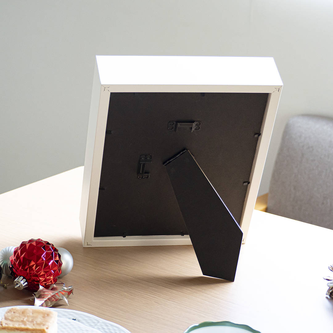 裏面には、フックを引っかけるための金具とフォトフレームのように立てて使うためのパーツがついているので壁にかけて使うことも、チェストやテーブルにそのまま飾って頂く事も出来ます。